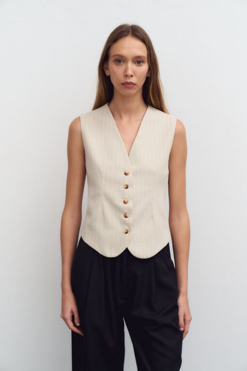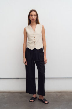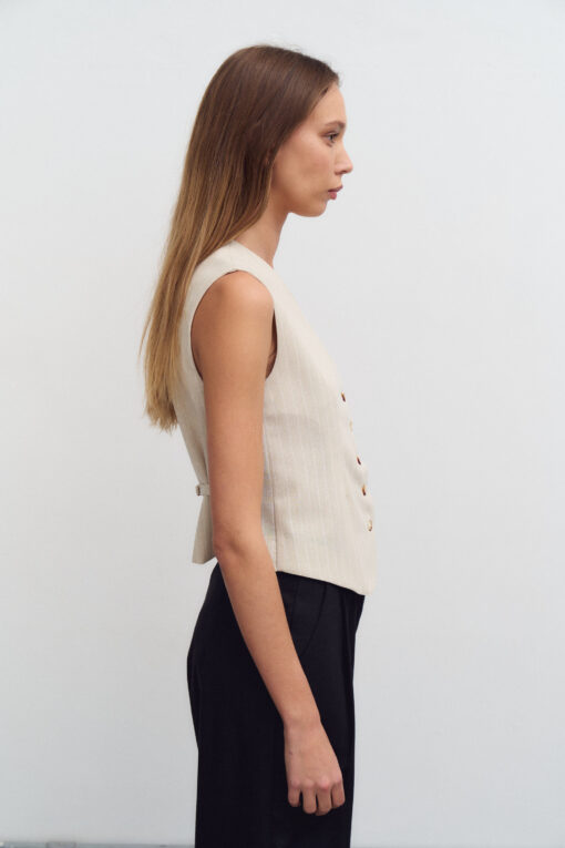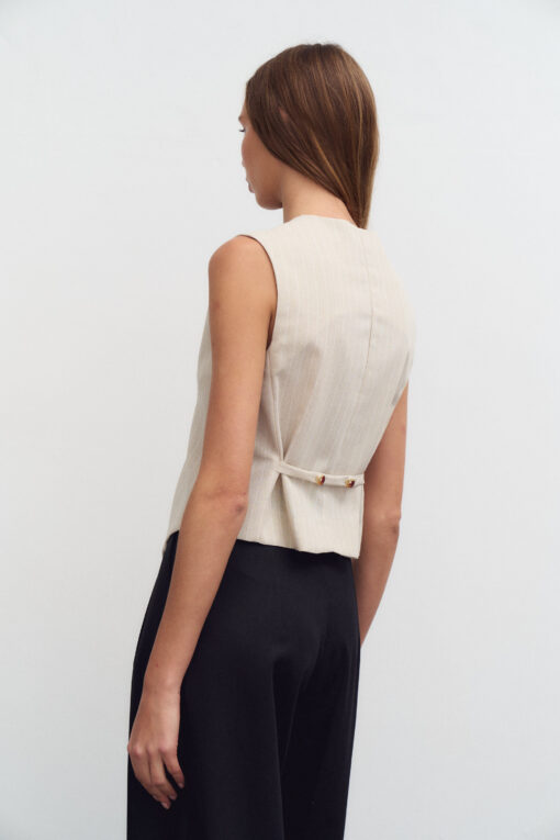 Chaleco sastrero de lino rayado. En la espalda posee una tira regulable con botones. No lleva forrería interna.