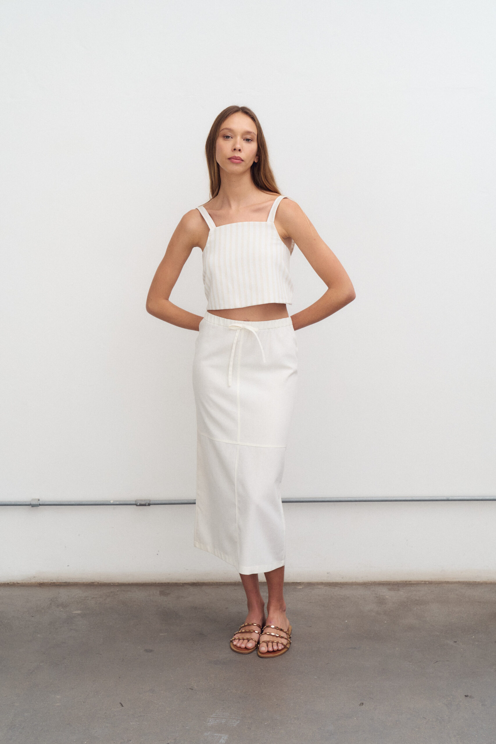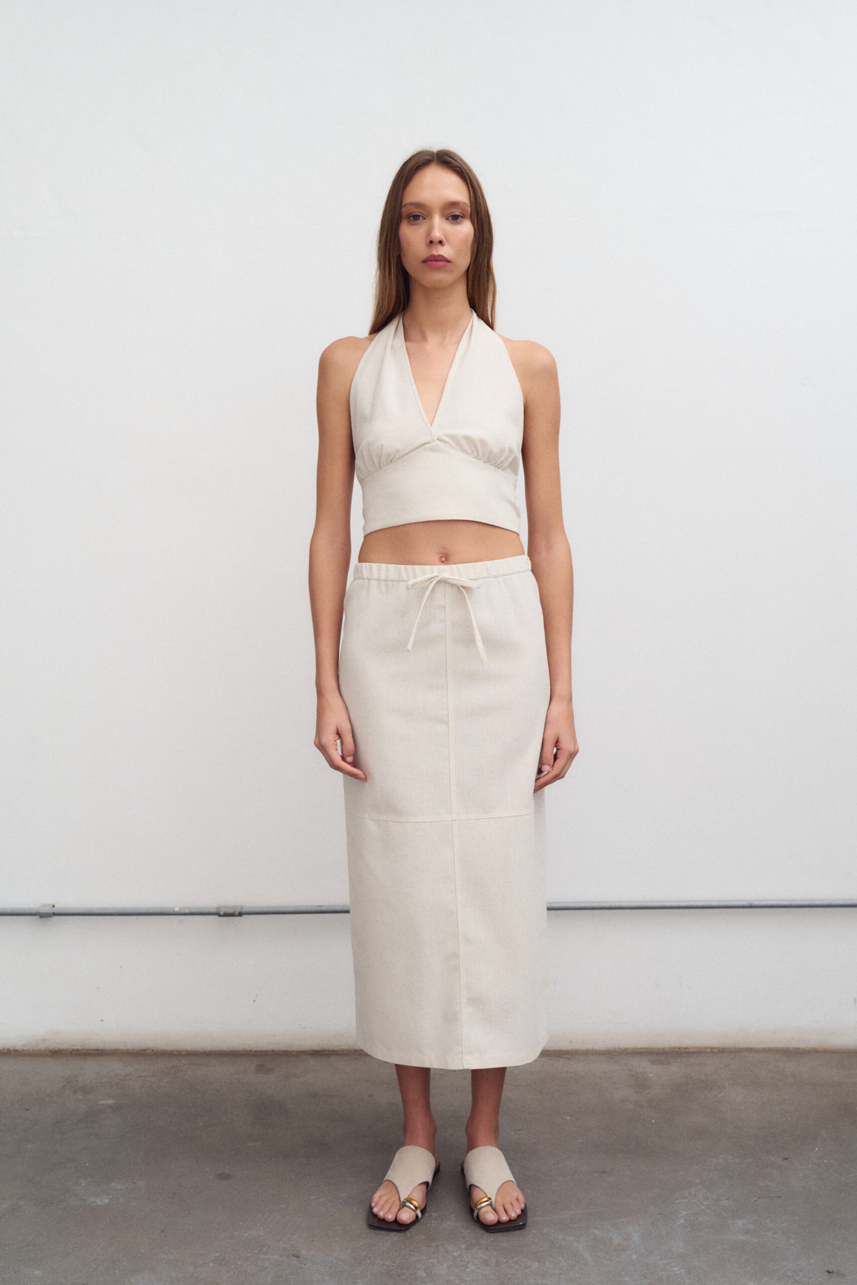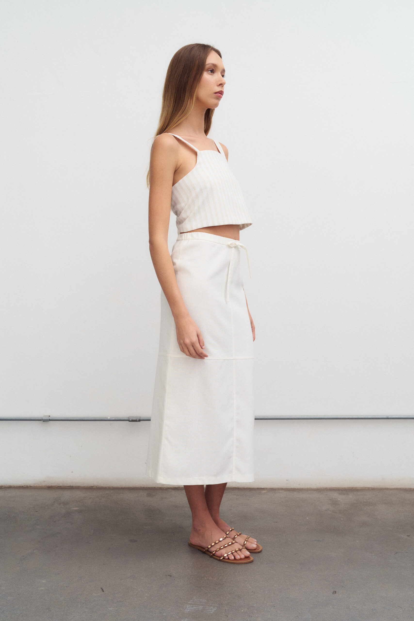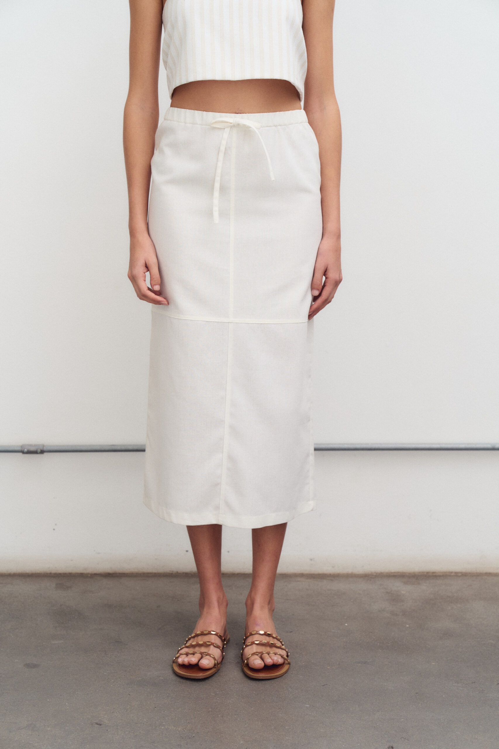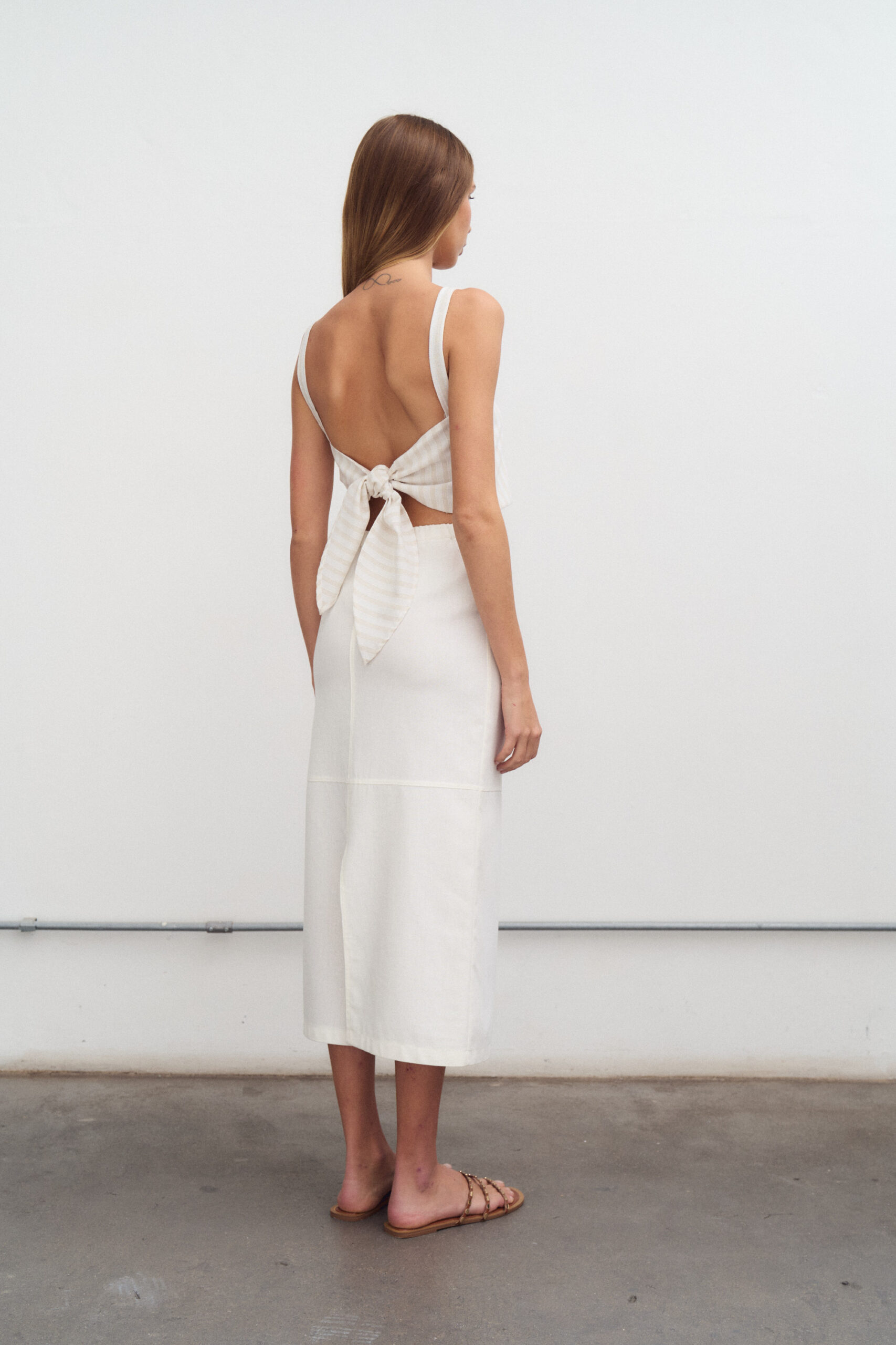 Falda midi de lino y tiro alto con recortes. Posee elástico y lazo aplicado en la cintura y tajo en la espalda.