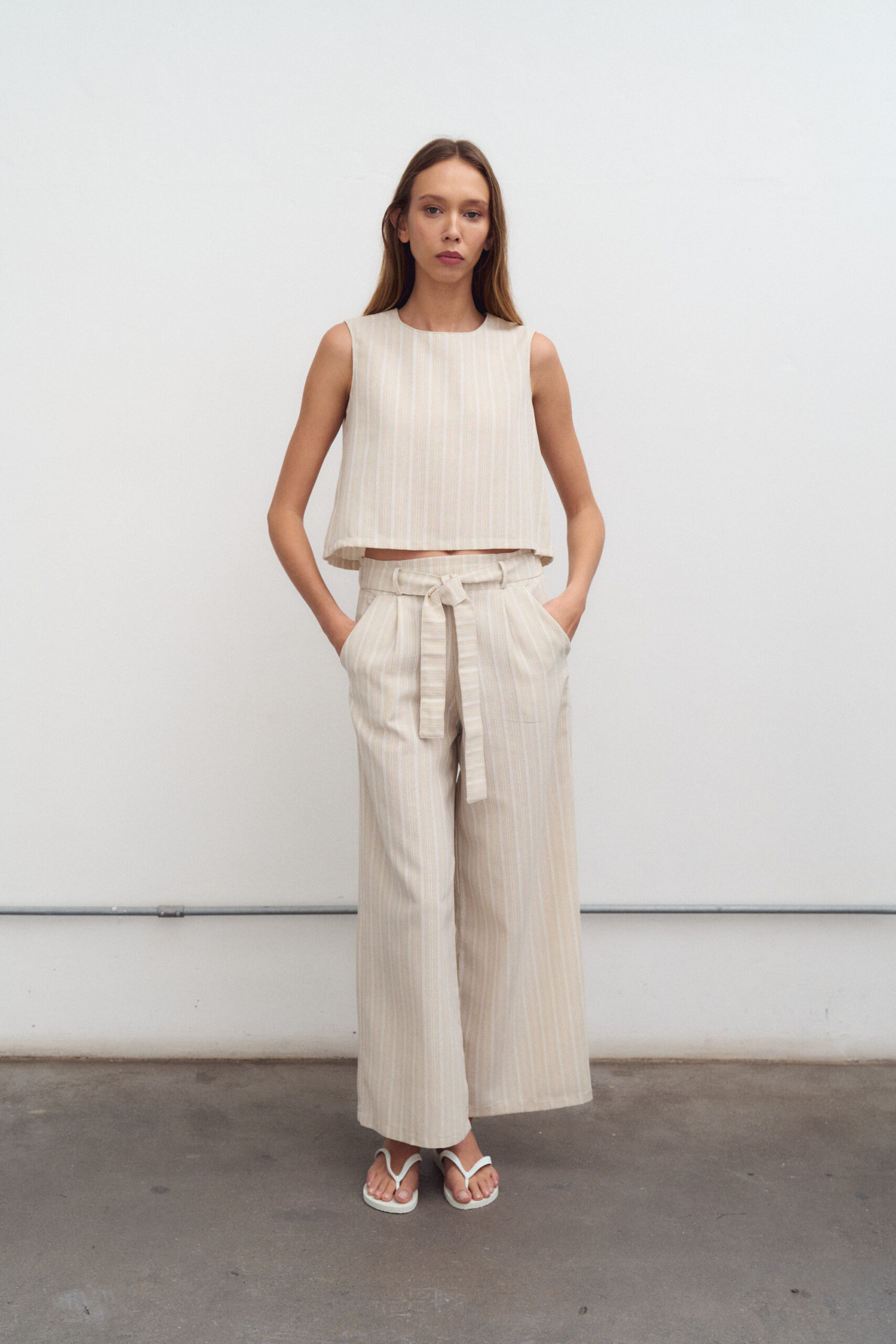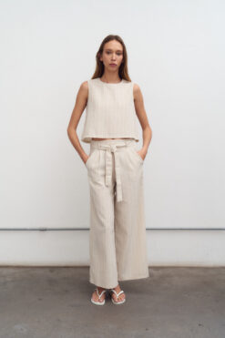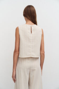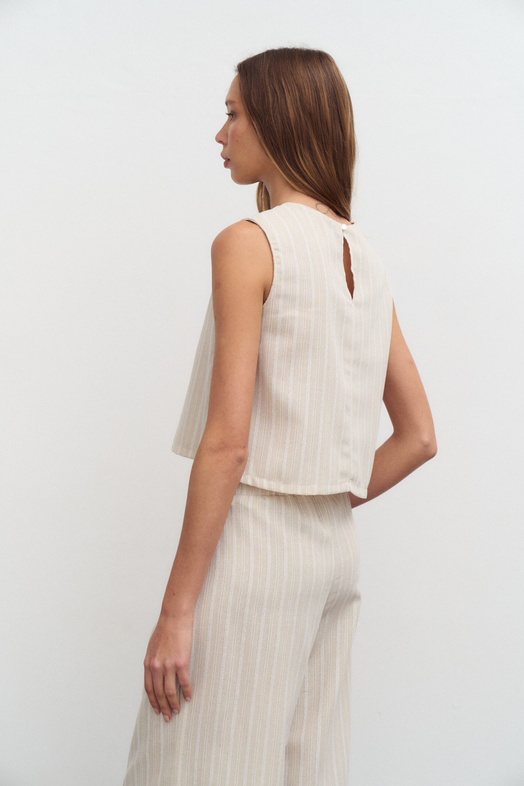 Musculosa rayada de lino. Posee abertura con botón en espalda.
