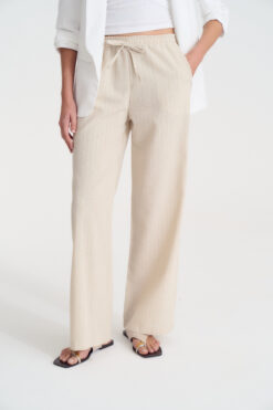 Palazzo cargo de lino elastizado y tiro alto con bolsillo plaqué
